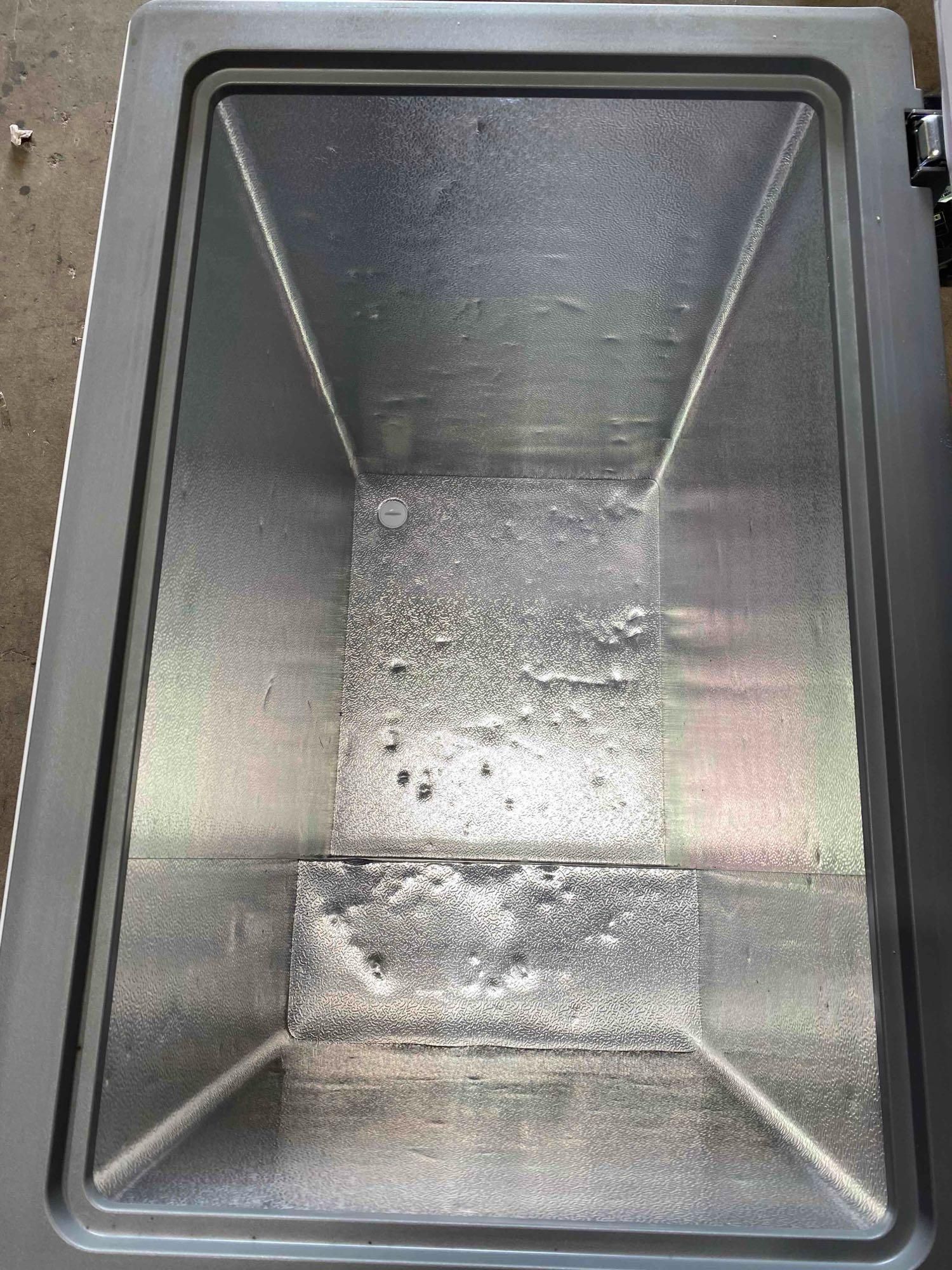 A counterbalanced hinge keeps the lid open for hands-free loading and unloading. It was tested and it works.